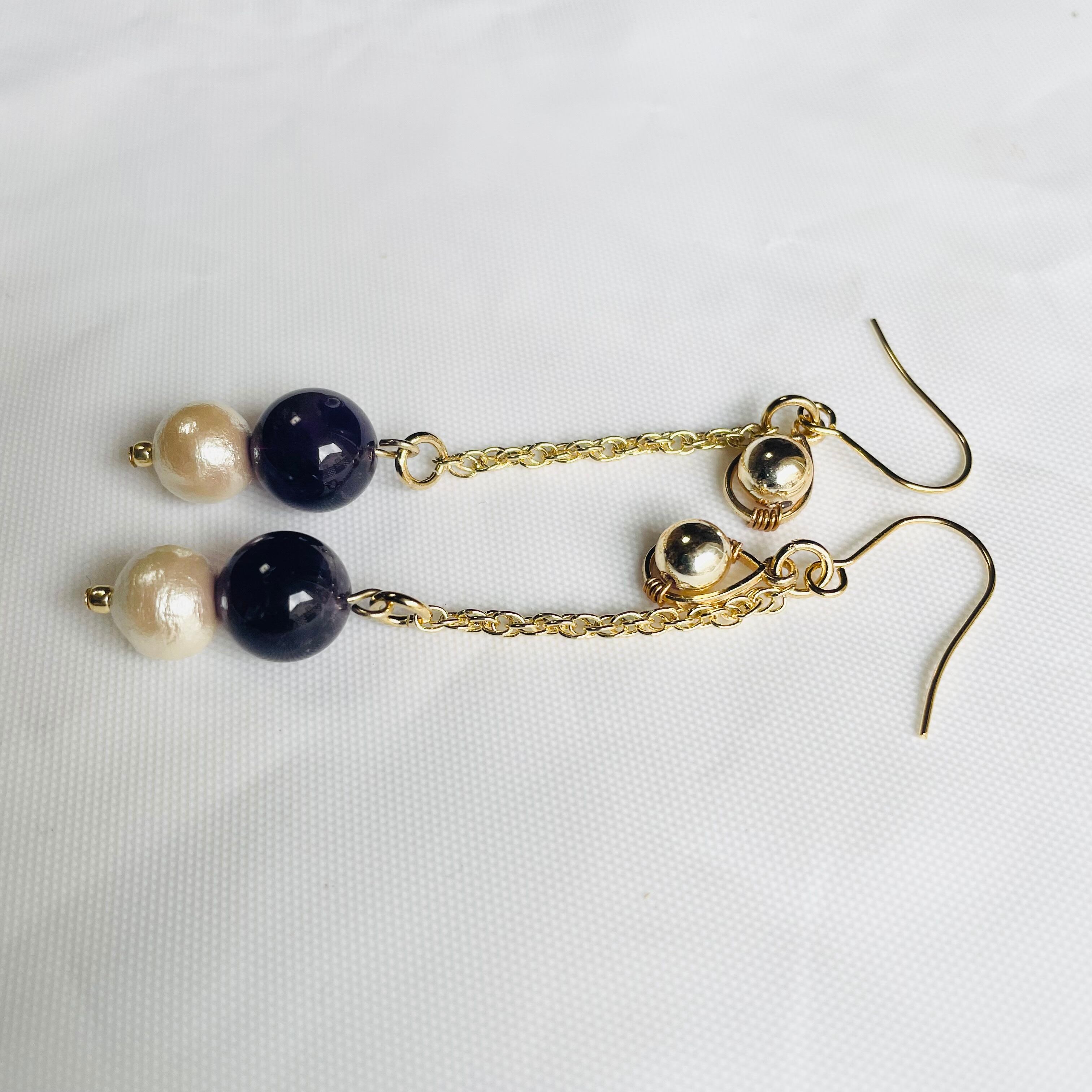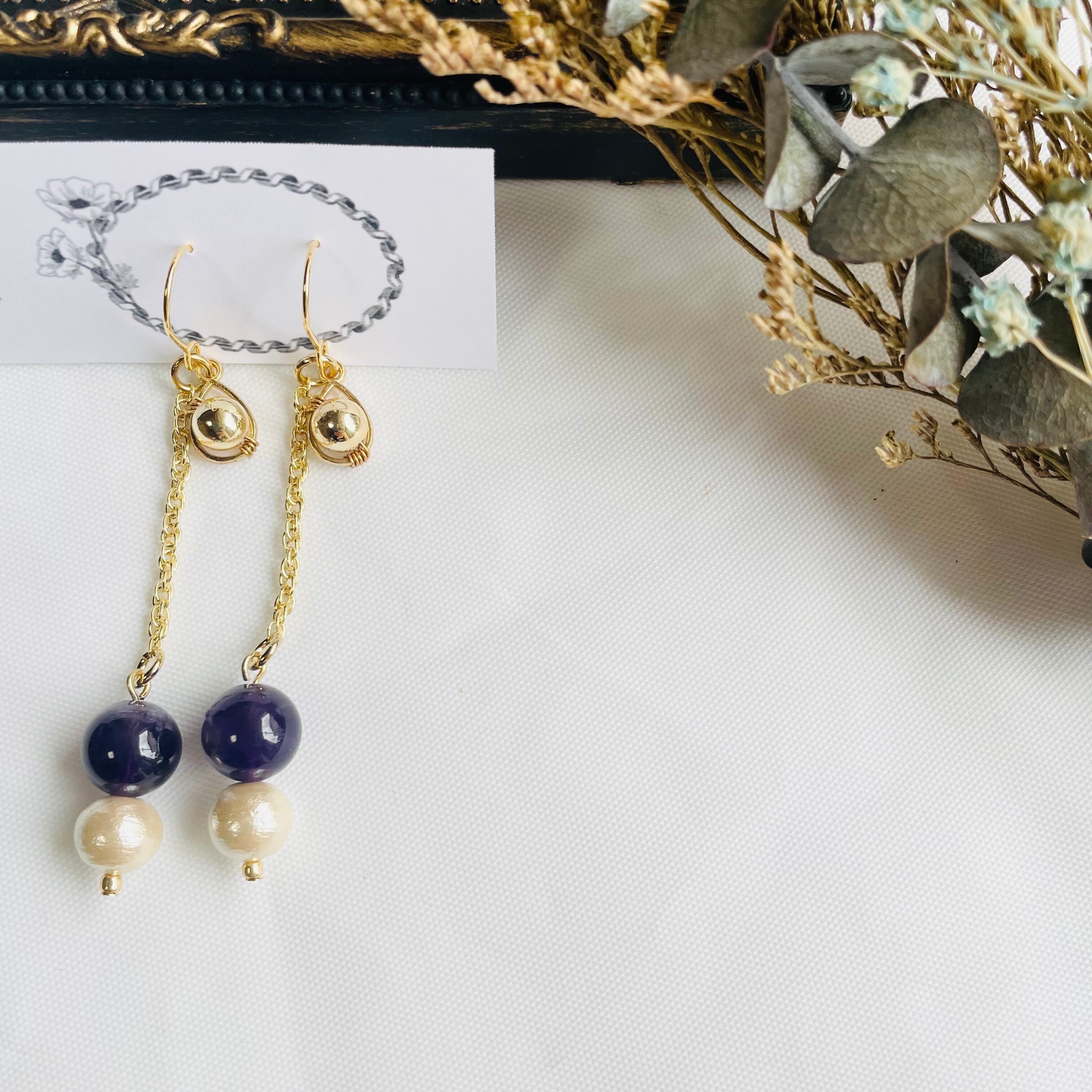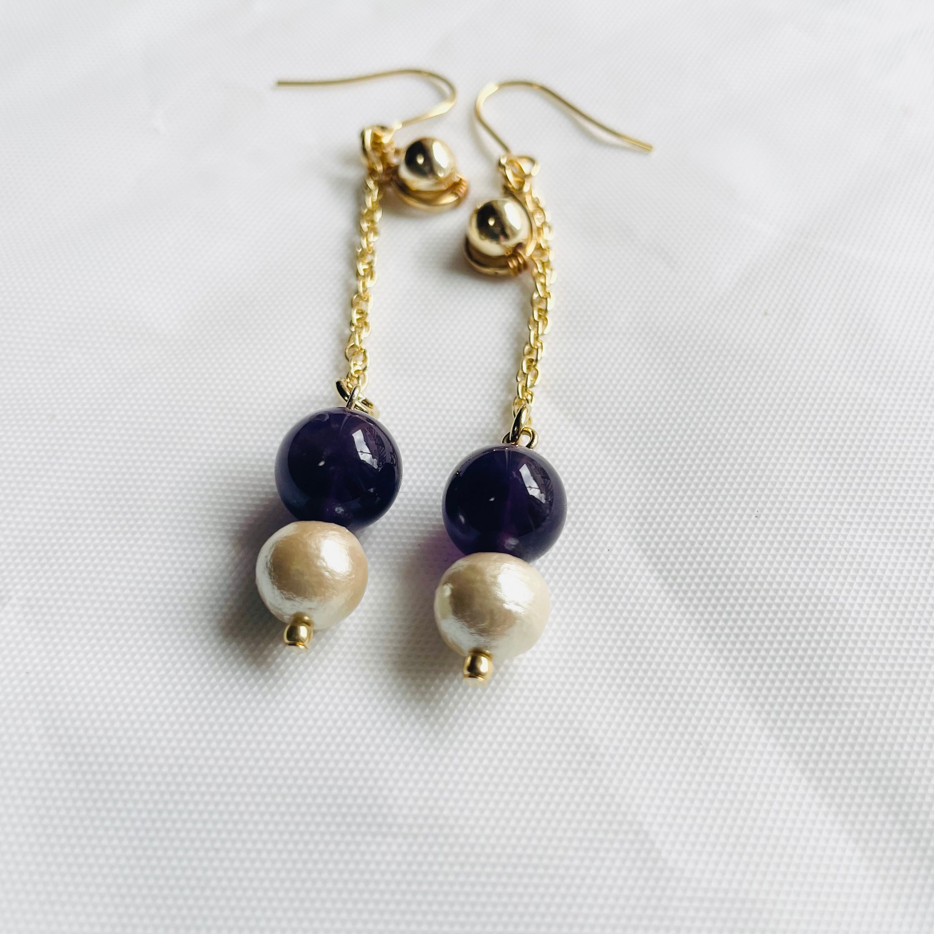 2月の誕生石であるアメジストを使用したロングピアスは、女性らしさと上品さを兼ね備えたデザインです。コットンパールが揺れることで、動くたびに優雅な輝きを放ちます。カジュアルなコーディネートにも合わせやすく、おしゃれな大人の女性にぴったりです。